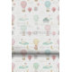 Float into a gentle dreamland with this charming nursery wallpaper. This enchanting pattern features sweet watercolor illustrations of swans gliding on tiny ponds, friendly elephants, and adorable bears, foxes, and lambs soaring high in beautifully striped pastel hot air balloons. Set against a clean white background, the scene is dotted with fluffy clouds, golden stars, and delicate pink cherry blossom trees. The soft color palette of blush pink, mint green, and pale yellow creates a magical, whimsical, and gender-neutral atmosphere, making it a perfect, serene backdrop for a nursery, child's room, or playroom. Search ID1234 to see products with this enchanting pattern. Note: design adapted from generative content.