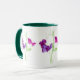 A pretty white ringer mug with purple and pink sweet peas on all sides from a watercolor painting by Judy Adamson. The handle and rim are Hunter green.