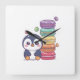 An adorable kawaii penguin sitting beside a colourful tower of delicious macarons.