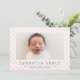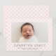 Announce your bundle of joy with style! This sweet and simple personalised birth announcement features a pink gingham pattern background and your baby's name, birth stats, and your name. This design is also available in blue and green! Tip: Use the "crop photo" button in the customising section.