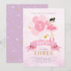 Personalised ballerina theme birthday invitation in pink and gold with starry purple back. Featuring ballerina in pretty pink tutu, simulated glittery gold wings and pink balloons. Sweet, girly, chic and elegant. Comes with front and back design. Customise with name, age and party details. Ballerina image options available. Perfect for ballet or fairy theme party.