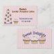 Whimsical bakery business cards done in a pink and cream striped background. Sweet graphics of a wedding cake and cupcake decorate the front of the card, and a trio of cupcakes, on the reverse side. Personalise the text, on the front for your cake baking business. Great for at home bakers and small businesses.