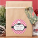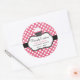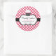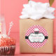 Sweet bakery box sticker done in pink with white polka dots. Graphics of a black and white decorative framed text area, has a pretty cupcake decorating the left side. Personalise all the text for your bakery business. Matching business cards available.