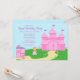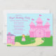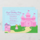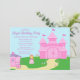 This 5x7 girls birthday party invite has a sweet royal princess theme. There is a hot pink castle in the background with a road lined with pink and blue flowers in the front. On the left, there is a blonde hair princess standing near a carriage that is driving down the road. At the top left, you can easily customise the party information. © 2012 Jessica Weible/JW Illustrations