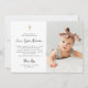 This simple and stylish, black and white religious Baptism or Christening invitation features whimsical, vintage style script typography and a faux gold cross with your baby's photo. An elegant, classic minimalist look that is still unique and contemporary and also gender neutral, for a boy or a girl.