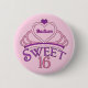 Personalised pretty sweet sixteen birthday party button with a pink tiara topped with a purple heart and your teenage girl's name inside of it. Cute Sweet Sixteen written in beautiful script for your princess who deserves a royal crown.