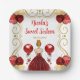This sweet sixteen plate features an elegant gold frame, a beautiful princess with red hair and a red dress, flowers and a balloon. This is perfect for a sweet sixteen birthday party.