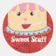 Cute Retro Colour Rusty Red. Pale Blue and Pink Bakery Cupcakes and Cookies Stickers. Cute Deep Rusty Red, Pink, Tan and Blue Cute Baked Goods with Adorable Eyes and kissable mouths with your business information or leave as is with "Sweet Stuff" written in white whimsical lettering..