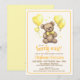 A fun play on words with these we can "bearly wait!" teddy bear baby shower invitations. Featuring a sweet little teddy bear with a soft yellow bow, yellow heart shaped balloons and yellow hearts.
