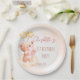 Sweet teddy bear birthday party personalised birthday party plates. Pastel pink colours teddy bear party personalised stickers with cute adorable teddy bear hugging hearts.