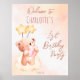 Sweet teddy bear birthday party personalised birthday welcome sign. Patel pink watercolor adorable teddy bear hugging stars, standing on a cloud with stars.