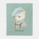 Sweet fleece blanket with loveable teddy bear in cute overalls and adorable hat. Personalise with your desired name choice. This will look so perfect in your little boys nursery or bedroom. Snuggle up with this little brown bear.