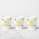 Cute 1st birthday party paper cups featuring the phrase "So Sweet to Bee One" in blue and yellow hand-lettering surrounded by illustrations of flying bees and honeycombs. Personalise these adorable bee-themed 1st birthday party paper cups with your child's name. The design repeats on the back of the paper cup.