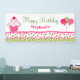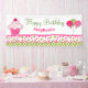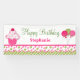 Pretty girly birthday banner done in pink, green, and white, with polka dot accents and graphics of lollipops and a cupcake. Personalise the green and pink text to read what you want.