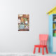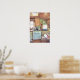 Take a visual trip back into time with this nostalgic vintage camper trailer poster. Warm vintage colours make this scene extremely inviting. The ceiling, cabinetry, and dinette table are shades of caramel brown. The walls are sage green, which is a perfect backdrop for a framed picture of a fish. A percolator coffee pot and a saucepan sit on the adorable vintage stove. A vase of pretty flowers sit on top of the dining table.