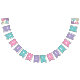 Designed to match our Sweet Collection birthday party invitations, this cute dessert themed bunting flag design features fourteen custom text fields to spell out your message (shown with "Happy Birthday") on varying pink, lavender, and aqua backgrounds. The first and last flags feature colourful watercolor doughnut illustrations on a white background.