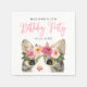 Cute cat birthday party napkins featuring a whimsical pink script and a painted watercolor cat with pink and mauve flowers near the bottom of the design. Personalise the cat-themed birthday party napkins with the birthday girl's name, age, and date.