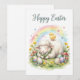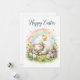 A cozy watercolor sheep resting on green grass under a soft rainbow. Featuring a cute chick and vibrant spring flowers for a joyful greeting.