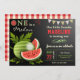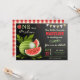 Amaze your guests with this cute watermelon theme birthday party invite featuring beautiful watermelons with modern typography against a chalkboard background. Simply add your event details on this easy-to-use template to make it a one-of-a-kind invitation. Flip the card over to reveal a red and beige gingham pattern on the back of the card.