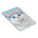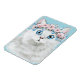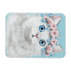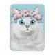 This design features a pretty white kitten wearing a pink and blue flower halo.