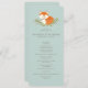 A lovely little fox is nestled all snug on a bed of leaves and branches in this sweet illustration by Kat Parrella. With a soft grey teal background, the colour scheme is neutral in this program card that is just perfect for a rustic, chic country, or popular woodland animal themed event.