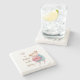 Adorable coaster features watercolor illustration of modern girl in blue dress sweetly hugging a large ball of yarn. Quote in light brown script: "Life is better with yarn". The perfect gift for knitters, crocheters, and other true fibre fans.