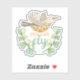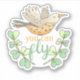 This sticker features the message "you can fly" in the centre of a pretty brown spotted songbird flying overhead and two green heart-leaf branches to the sides. A motivational message with a sweet illustration!