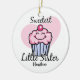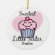 Our SWEETEST LITTLE SISTER design is a cute way to celebrate the little sister is in your family. Featuring a sweet smiling cupcake with pink frosting and a big red cherry on top with a pink heart background. Perfect for a birthday or your Christmas tree. Customisable text. Also available on T-shirts and gifts. PinkInkArt original!