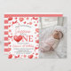 A sweetheart-themed first birthday photo invitation featuring red watercolor hearts, bows, and elegant modern typography alongside a customizable baby photo. Perfect for celebrating a little one turning one and ideal for heart-themed, girly, or sweet first birthday parties. Coordinates with matching party décor and stationery.