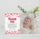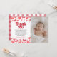 A sweetheart-themed first birthday thank you card with photo, featuring red hearts, bows, and classic typography. Perfect for thanking guests after a baby girl’s 1st birthday celebration, this printable thank you card includes space for a child’s photo and a heartfelt message. Ideal for heart-themed or Valentine-inspired birthdays, suitable for print or digital use.