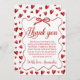 Sweetheart-themed thank you card for a first birthday celebration, featuring red hearts, a delicate bow frame, and elegant script typography. Perfect for Valentine-inspired or heart-themed birthday parties for a baby girl. This printable and customizable thank you card allows you to personalize the message and name, creating a charming keepsake to thank guests for celebrating and for their thoughtful gifts.