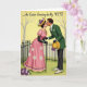 This design shows a vintage-style illustration of a fashionable couple leaning in for a kiss in a springtime garden, their faces close with a tender, romantic focus. The woman wears a flowing pink gown with small white floral details and gold edging, plus black gloves and a sunny yellow hat topped with purple-and-white flowers. Her partner bends toward her in a deep green suit with a white bow tie and dark trousers, holding a matching yellow hat decorated with similar blossoms, as if pausing mid-courtship. Behind them, a pale golden sky glows above thin, dark tree branches and a delicate black iron fence, framing the pair like a quiet stage. Underfoot, a bright green lawn is sprinkled with purple and white blooms that echo the flowers on their hats, adding a gentle 🌷 touch. The greeting appears near the top in a soft, dark font, sitting clearly against the light sky without crowding the artwork. Color accents of pink, green, yellow, and purple guide your eye from their clasped posture to the surrounding garden details, creating a feeling of closeness without needing extra words. A slim black fence line runs horizontally behind them, with bare branches reaching upward like fine ink strokes 🐇.