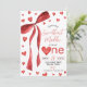 Celebrate your little sweetheart’s first birthday with this elegant watercolor red bow and hearts invitation. Featuring classic script and a soft aesthetic, it’s perfect for a Valentine's or heart-themed 1st birthday party. Easily customize with your daughter's name and event details.