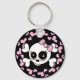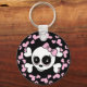 Cute skull and crossbones with bow is surrounded by pink hearts.