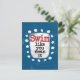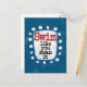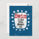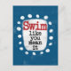 A cute typographic swimmer design that says "Swim Like You Mean It". It features black and red text on a white rectangle with funky, playful white dots surrounding it, all on a blue background.