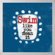 A cute typographic swimmer design that says "Swim Like You Mean It". It features black and red text on a white rectangle with funky, playful white dots surrounding it, all on a blue background.