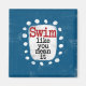 A cute typographic swimmer design that says "Swim Like You Mean It". It features black and red text on a white rectangle with funky, playful white dots surrounding it, all on a blue background.