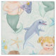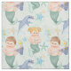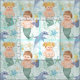 Sweet fantasy pattern features child mermaids. Little Mer-boy and Mer-girl are swimming with cute dolphin, starfish and seahorses over a light aqua blue sea weed background.