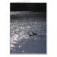 Two geese swimming towards sunlight sparkling off the lake