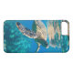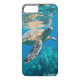 Underwater photograph of a sea turtle swimming in crystal clear water just below the surface.