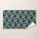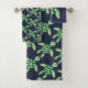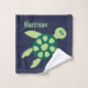 Bright green illustrated swimming turtles on dark blue towel set including personalised face cloth for kids.