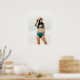 A woman in a teal swimsuit and straw hat walks on the beach. She appears happy and carefree as she basks in the ocean breeze.