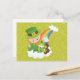 Pretty white swirls on a yellow green background, mix and match with our other St. Patrick's Day designs for some fun combinations! This cute and colourful postcard features the swirls background with a cute leprechaun in a green hat and striped socks relaxing with a beer on a cloud after sliding down a colourful rainbow!