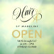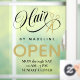 Opening hours window cling for your hair salon or hair styling business with Hair written in a black swirly calligraphy script next to a pair of gold coloured scissors. Personalise with your opening hours.