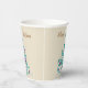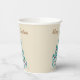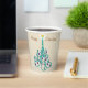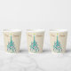 Beautiful paper cup with an original digital painting by Leslie Sigal Javorek of a swirly turquoise Christmas tree w/ violet ornaments on a Trompe L'oeil (trick of the eye) background illusion of fine bone china & greater depth.