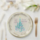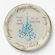 Beautiful paper plate with an original digital painting by Leslie Sigal Javorek of a swirly turquoise Christmas tree w/ violet ornaments on a Trompe L'oeil (trick of the eye) background illusion of fine bone china & greater depth. 2 custom text fields to personalise plate for a great gift.