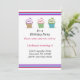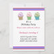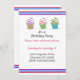 A fun and bold swirly cupcake birthday invitation. Swirls of purple, pink and chocolate frosting make up these delicious cupcakes. Stripes of deep pink, blue and purple accent the ends. Cute design on the back as well. Customise with all of your party information as desired.