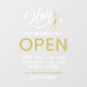 Opening hours window cling for your hair salon or hair styling business with Hair written in a white swirly calligraphy script next to a pair of gold colored scissors. Personalize with your opening hours. Add your phone number too so your clients know where to call to make an appointment.