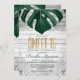 Elegant, rustic, and country tropical beach Swiss Cheese Monstera leaves on rustic white wood and lace with faux printed gold foil typography summer Sweet 16 birthday celebration party Invitations. This classic and sophisticated design is perfect for the classy, trendy, and stylish birthday girl. Personalise with your own message on the front and a customised monogram initial on the back. All photo print design.