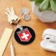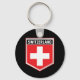 The national flag of Switzerland is infused into a shield shape that also has the country name set above the flag.